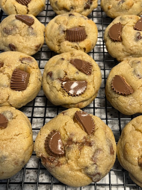 Rich, silky, chocolate chip cookies with huge pieces of Reeses peanut butter cups laid across the top to give you that candy bar & cookie combo that's hard to pass up!