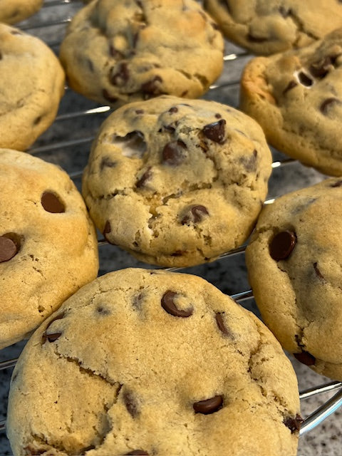 Chocolate chip based cookie stuffed with graham crackers, Hersheys location and mini marshmallows! Exactly what you would crave from a fireside smores!