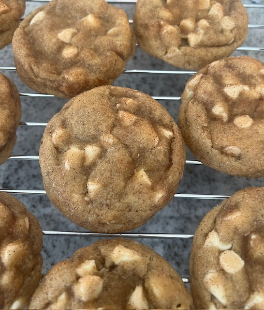 Churro cookie meets White Chocolate. Think of a delicious churro cookie rolled in sugar and cinnamon with that added flavor of white chocolate chips!