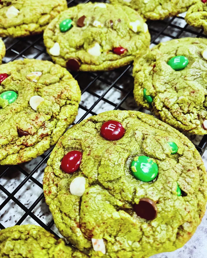 Chewy cookie butter cookie with festive M&Ms, white chocolate chip and pieces of peppermint. Perfect for the holidays!