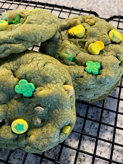 What better way to spend St. Patrick's Day than enjoying some of our green cookie butter lucky charms cookie. Soft and chewy on the inside with a mix of lucky charm for that added crunch.