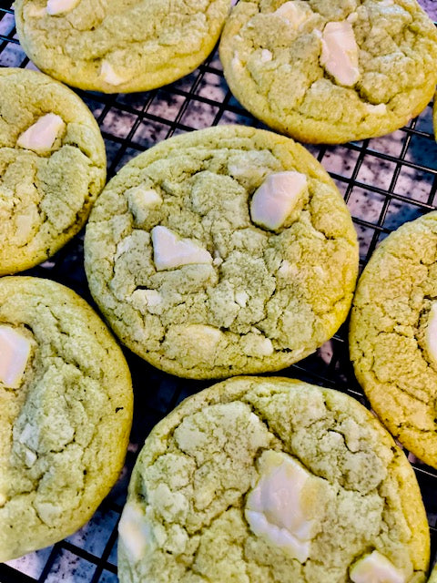 Super soft and chewy green matcha cookies with pieces of white chocolate mixed in. Perfect balance of sweetness and matcha flavor.