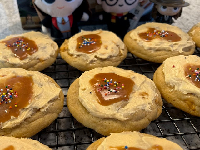Try our extra chewy cookies flavored with butterscotch, vanilla and butter flavor, frosted with butterscotch buttercream and drizzled with butterbeer caramel sauce!